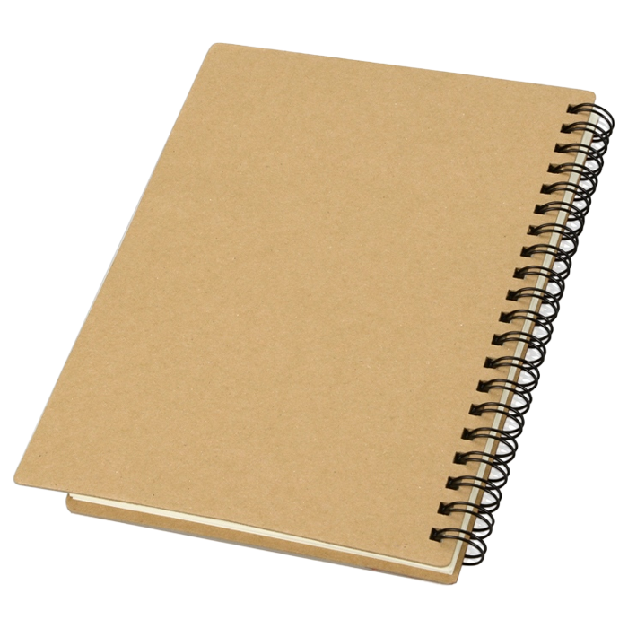 Спиральный блокнот в твёрдой крафтовой обложке с вертикальной тканевой вставкой. Оснащён ручкой в тон, закреплённой на боковой петле — всегда под рукой для быстрых заметок.