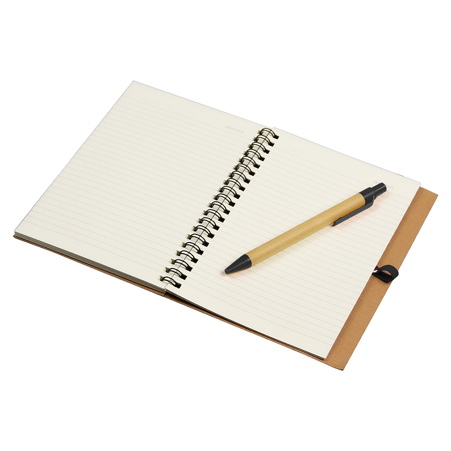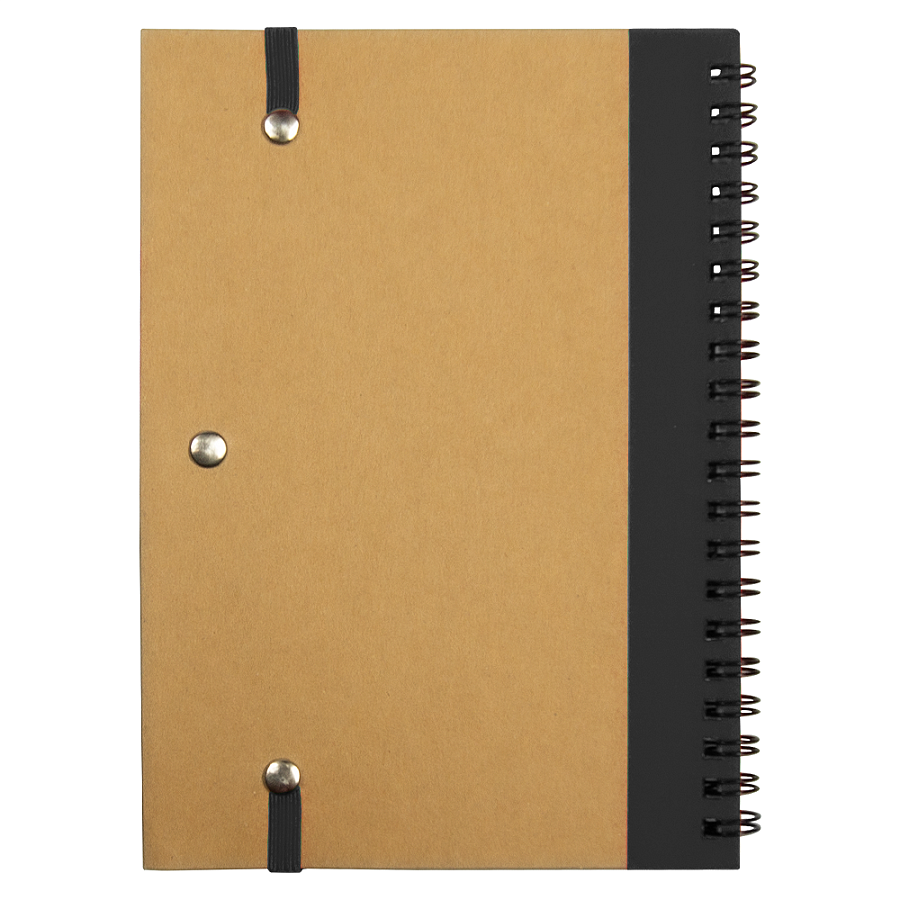 Спиральный блокнот в твёрдой крафтовой обложке с вертикальной тканевой вставкой. Оснащён ручкой в тон, закреплённой на боковой петле — всегда под рукой для быстрых заметок.