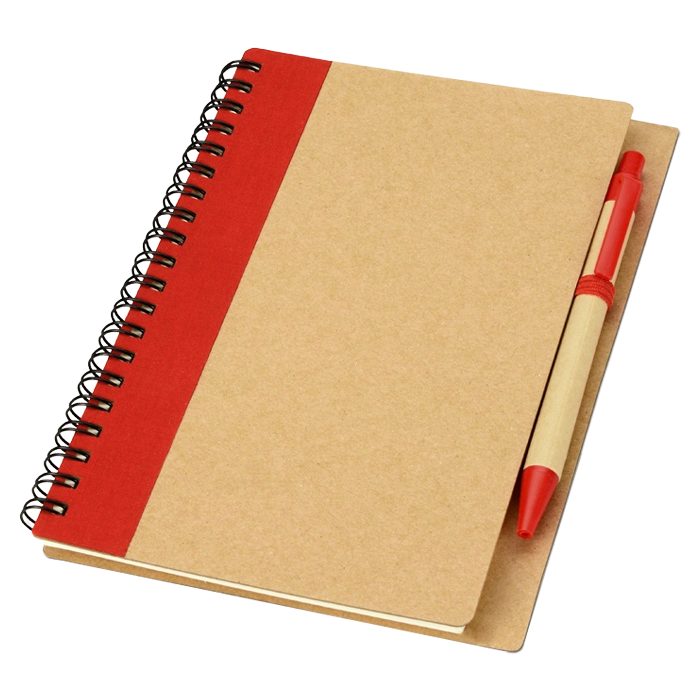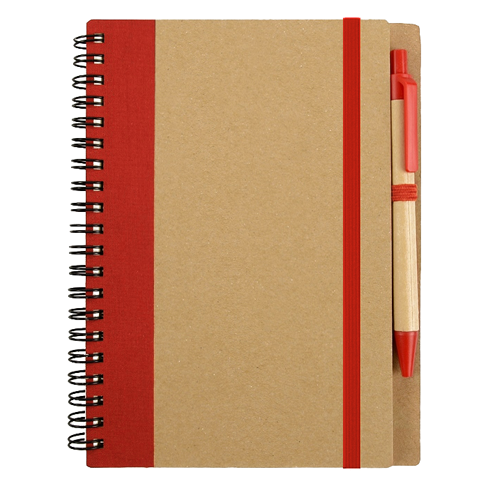 Спиральный блокнот в твёрдой крафтовой обложке с вертикальной тканевой вставкой. Оснащён ручкой в тон, закреплённой на боковой петле — всегда под рукой для быстрых заметок.