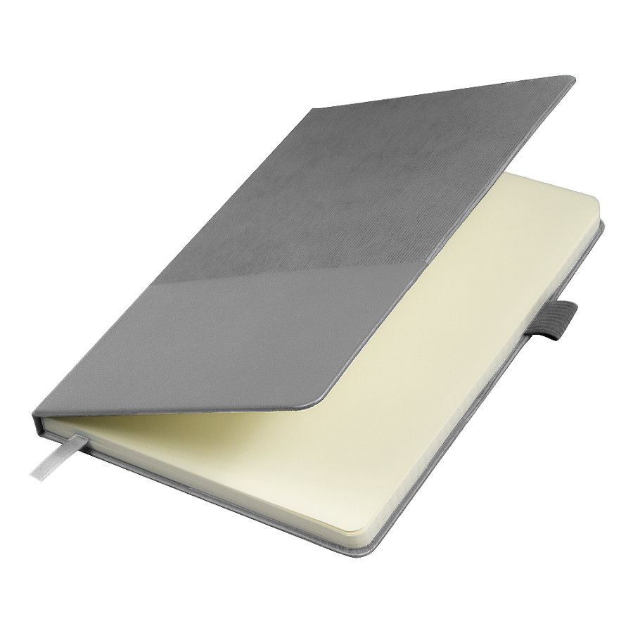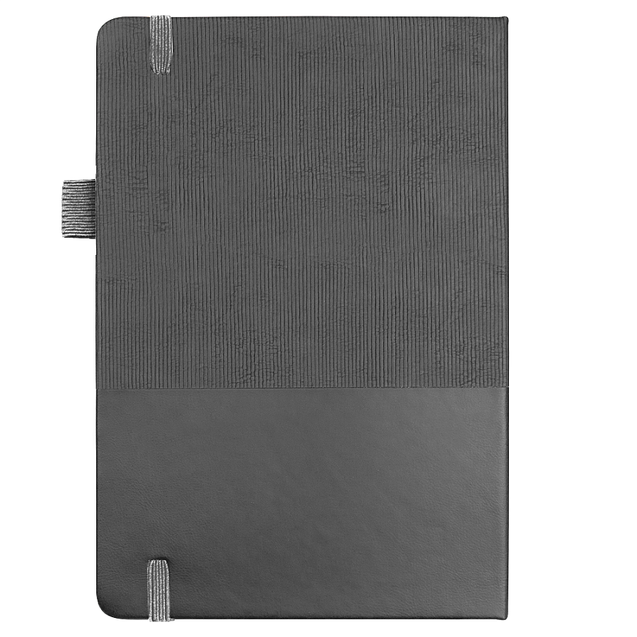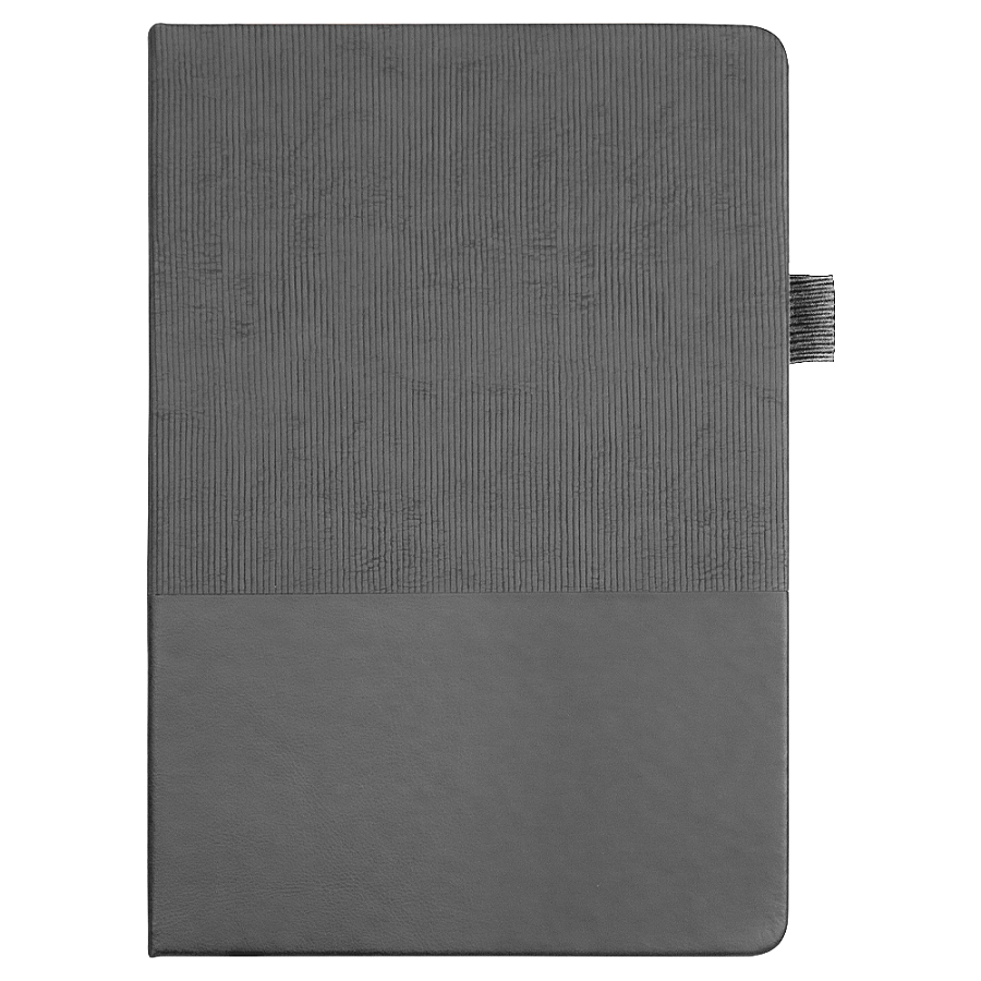 Стильный блокнот в твёрдой обложке с текстурированной верхней частью и гладким нижним сегментом. Оснащён вертикальной резинкой для фиксации и петлёй для ручки — всё под рукой.