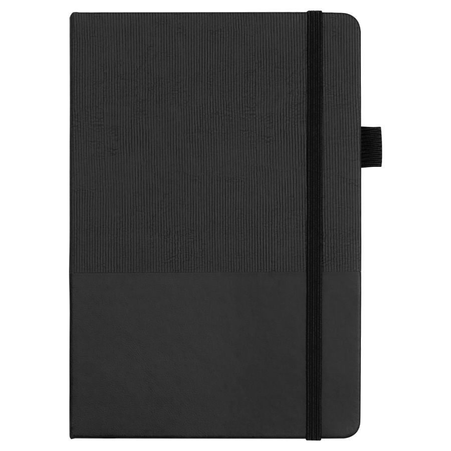 Стильный блокнот в твёрдой обложке с текстурированной верхней частью и гладким нижним сегментом. Оснащён вертикальной резинкой для фиксации и петлёй для ручки — всё под рукой.