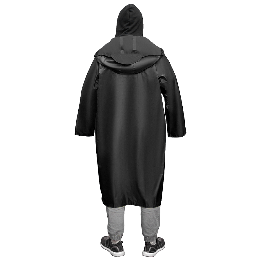 Унисекс-модель из плотного полиэстера с водоотталкивающей пропиткой. Длинный крой до колена, капюшон с утягивающими шнурами и застёжка на кнопках обеспечивают комфорт и надёжную защиту в дождливую погоду. Свободный силуэт не сковывает движения, подходит для мужчин и женщин.