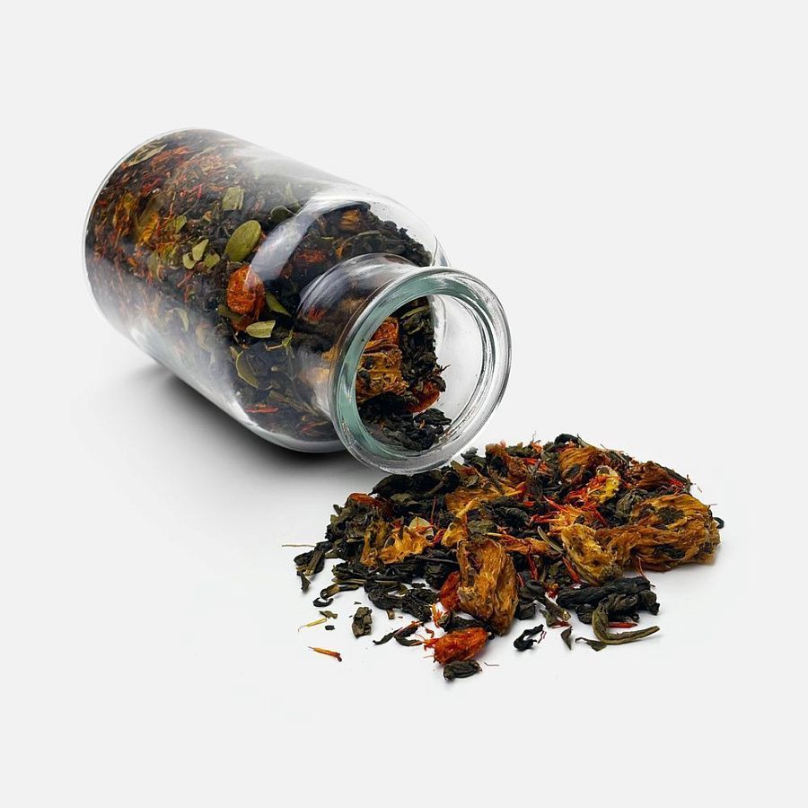 Состав: чай зеленый с ананасом и соком ананаса (чай зеленый байховый крупнолистовой, кусочки ананаса, сок ананаса), цветки сафлора, толокнянка, облепиха сублимированная, ароматизатор натуральный Персик, ароматизатор натуральный Груша.
