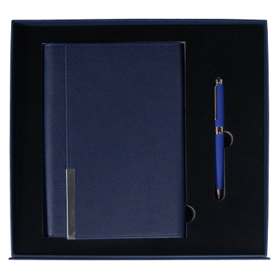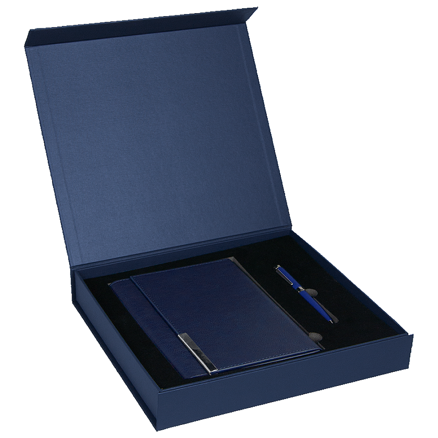 Сдержанный и выразительный комплект, созданный для деловых моментов и ежедневных ритуалов планирования. Темно-синяя и черная палитра задают тон — строгий, но с характером, который ощущается в каждой детали. Фактурная упаковка с магнитным клапаном под индивидуальную вырубку подчеркивает премиальность, превращая набор в готовое решение для презента или корпоративного события.