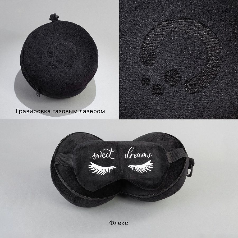 "2Go" - когда дорога в радость! Компактный аксессуар 2в1: маска и подушка для путешествий легко поместится в сумке или рюкзаке, можно использовать карабин для крепления снаружи. Практичный черный цвет.