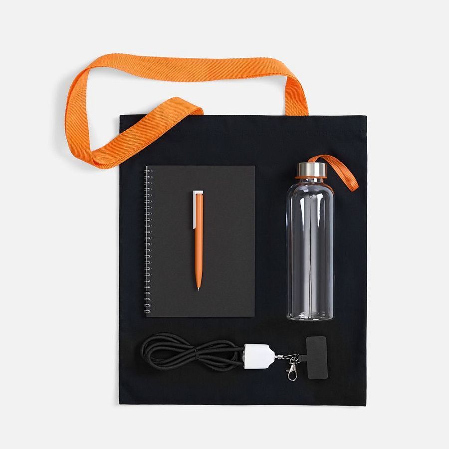 сумка - хлопок, 240 г/м²; ручки - полиэстер; кабель-ланьярд - нейлон, пластик; металл; бутылка - пластик, пищевой; крышка - металл, пластик; блокнот - бумага, картон; ручка - пластик