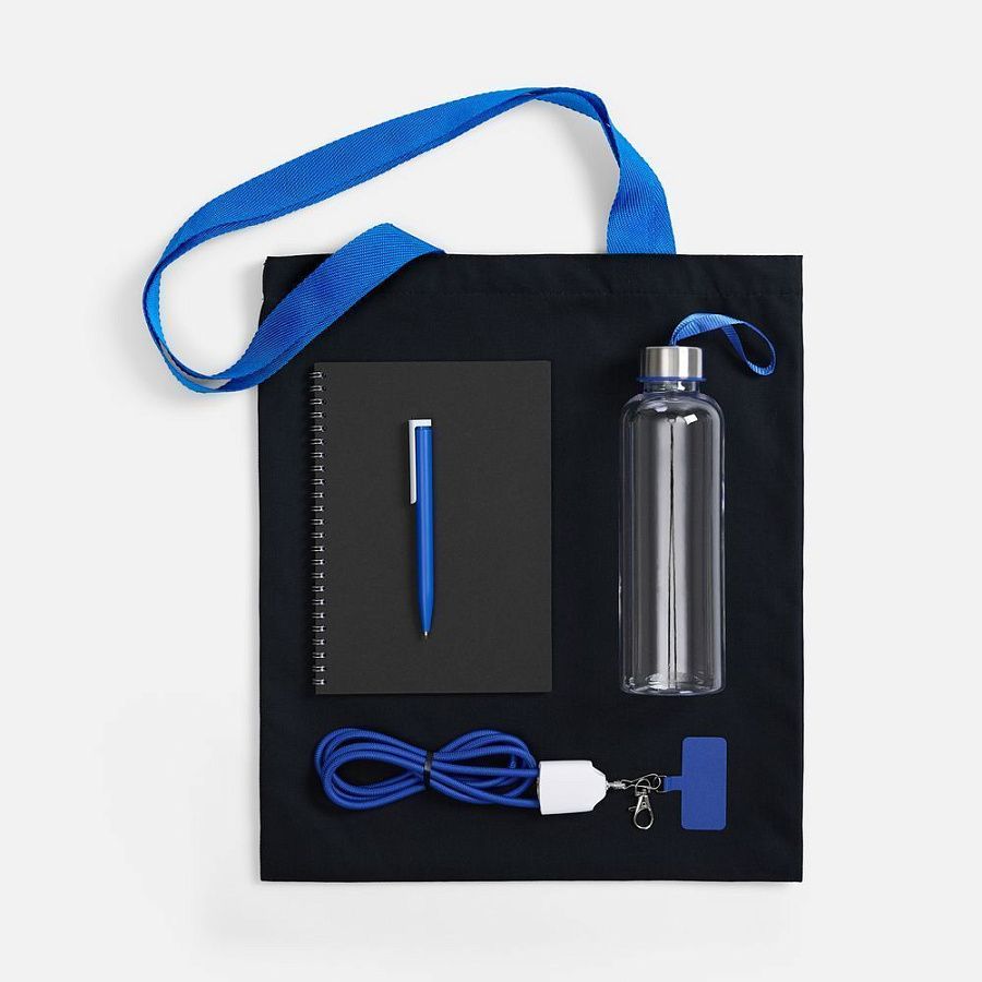 сумка - хлопок, 240 г/м²; ручки - полиэстер; кабель-ланьярд - нейлон, пластик; металл; бутылка - пластик, пищевой; крышка - металл, пластик; блокнот - бумага, картон; ручка - пластик