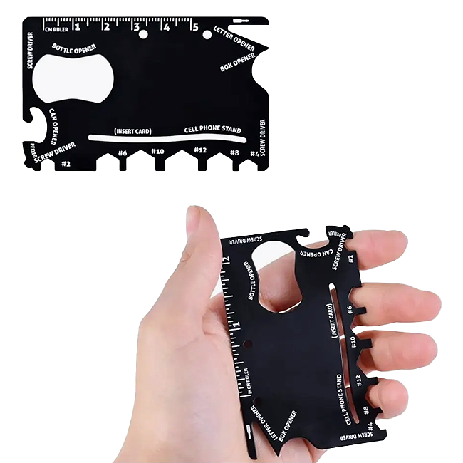 Компактный многофункциональный инструмент, который легко помещается в бумажник или крепится к ключам как брелок. Идеален для мелкого ремонта, путешествий, велопрогулок, активного отдыха и просто как полезный подарок на любой случай.