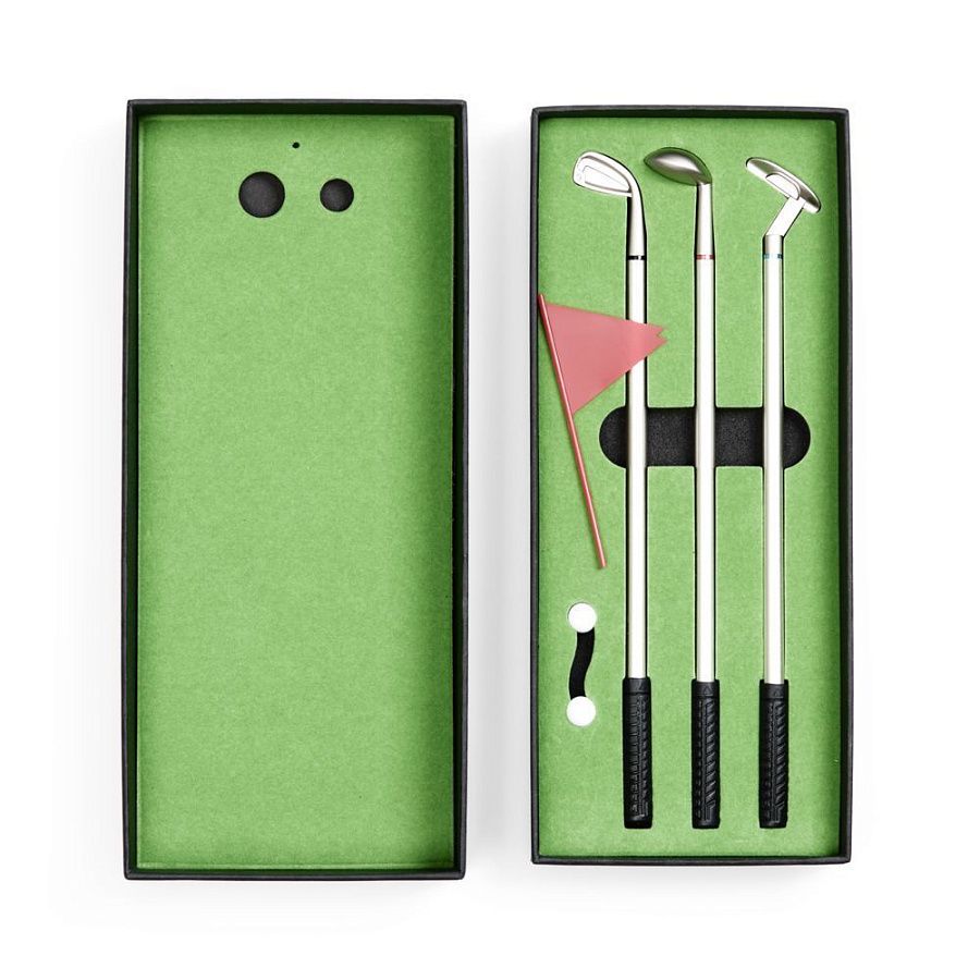 В комплекте: 3 клюшки-ручки со сменным стержнем с синими, черными и красными чернилами, 2 мячика для гольфа, флажок и подарочная коробка.Не является детской игрушкой. Не предназначено для детей!