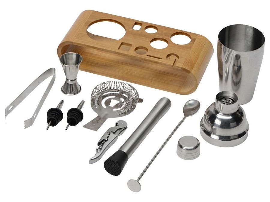 бамбуковая подставка- 27,3 х 10,6 х 6,6 см, барная ложка, джиггер 15/30 мл, гейзер -2 шт, мадлер, штопор, стрейнер, щипцы для льда, шейкер 550 мл