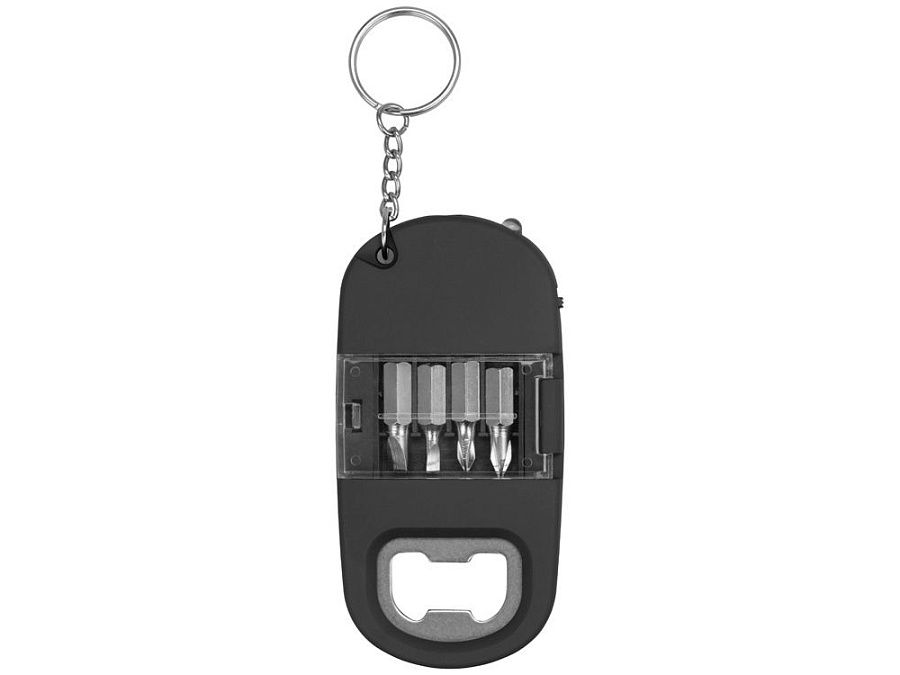 Брелок включает в себя 2 плоские и 2 крестообразные насадки и прочную металлическую открывалку. Корпус сделан из плотного пластика с мягким покрытием soft-touch. Встроенный фонарик позволяет подсвечивать рабочую зону.