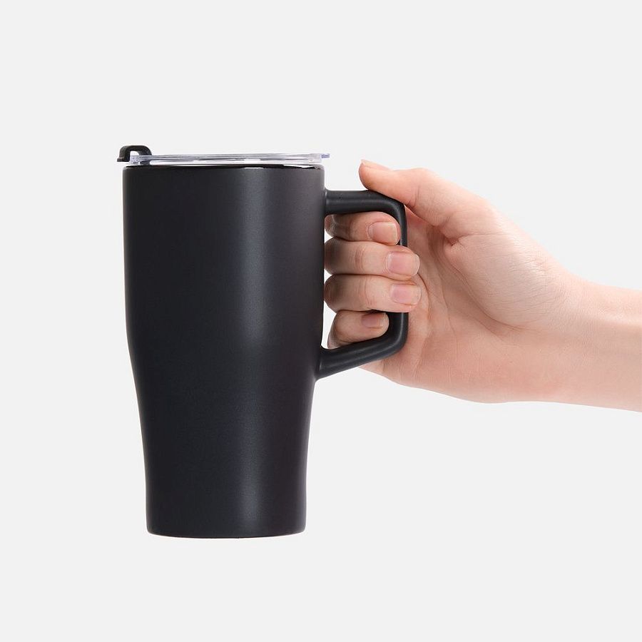 Эргономичная ручка удобно лежит в руке, а прозрачная крышка с отверстием для питья не дает содержимому разлиться на ходу или быстро остыть. Последнее особенно важно с учетом большого объема — 520 мл чая, кофе или какао хватит надолго.