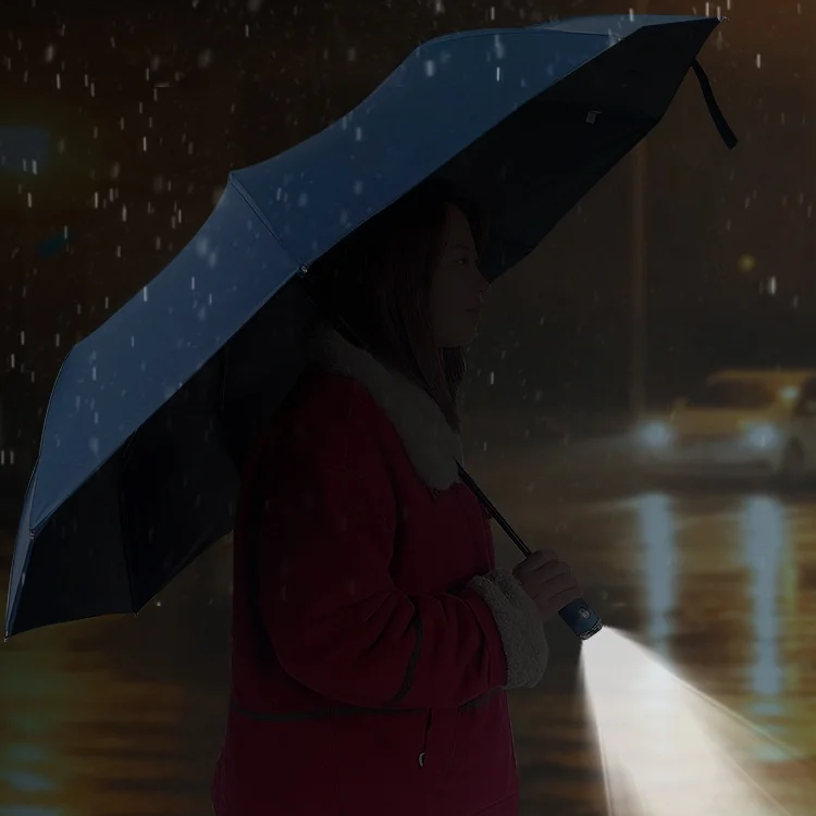 Ручка зонта в зоне держания рукой выполнена из пластика с покрытием софт тач, имеет удобный ремешок на руку. А так же оснащена фонариком.