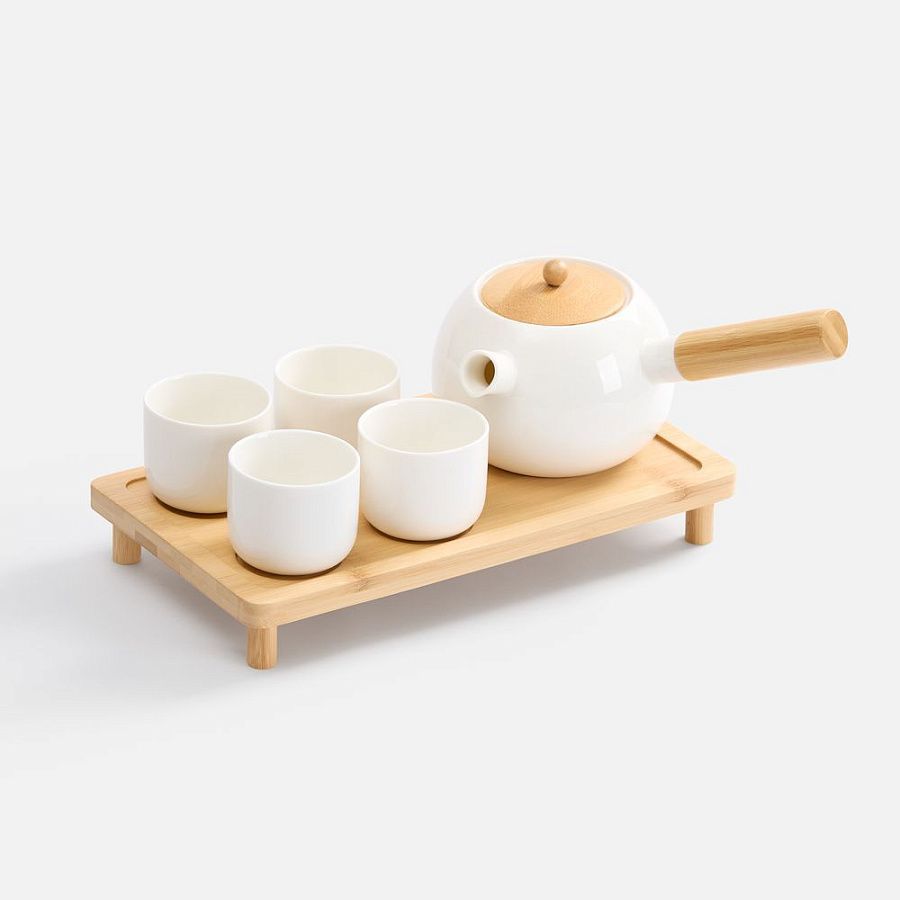 чайник, чашки - фарфор; поднос, крышка и ручка у чайника - бамбук
