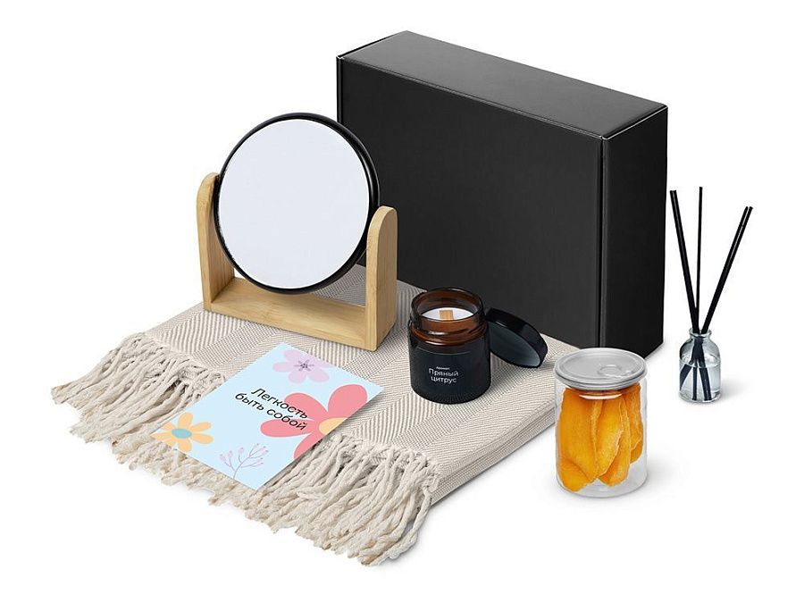 Re:f. Shelter — о чувстве защищённости и тихом пространстве для себя. Укутайтесь в плед, зажгите свечу, пусть диффузор наполнит комнату мягким ароматом — так создаётся настроение покоя и уюта. Зеркало становится маленькой деталью внимания к себе, а сушёное манго добавляет солнечную, тёплую нотку, напоминая о простых радостях. Этот набор — про личное укрытие, где можно выдохнуть, замедлиться и просто побыть в моменте.