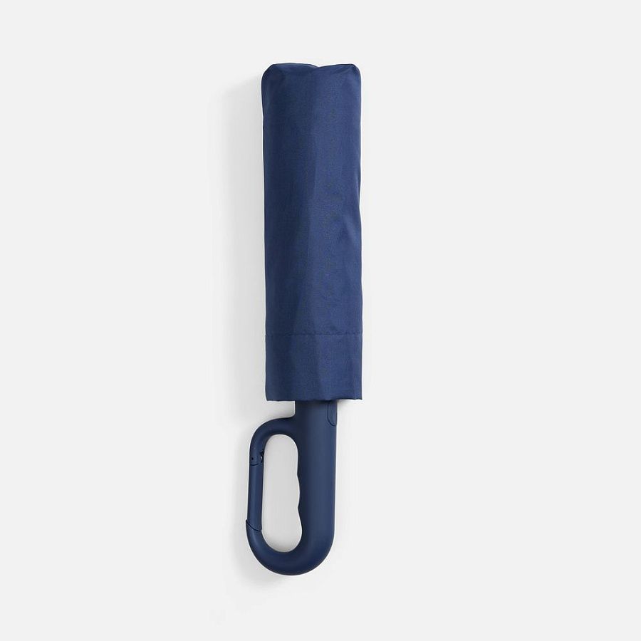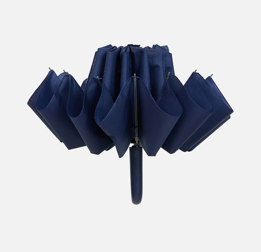 Преимущество обратного сложения заключается в том, что при закрытии внутренняя поверхность зонта остается снаружи, а мокрая сторона — внутри. За ручку-карабин удобно подвесить зонт на рюкзак или сумку.