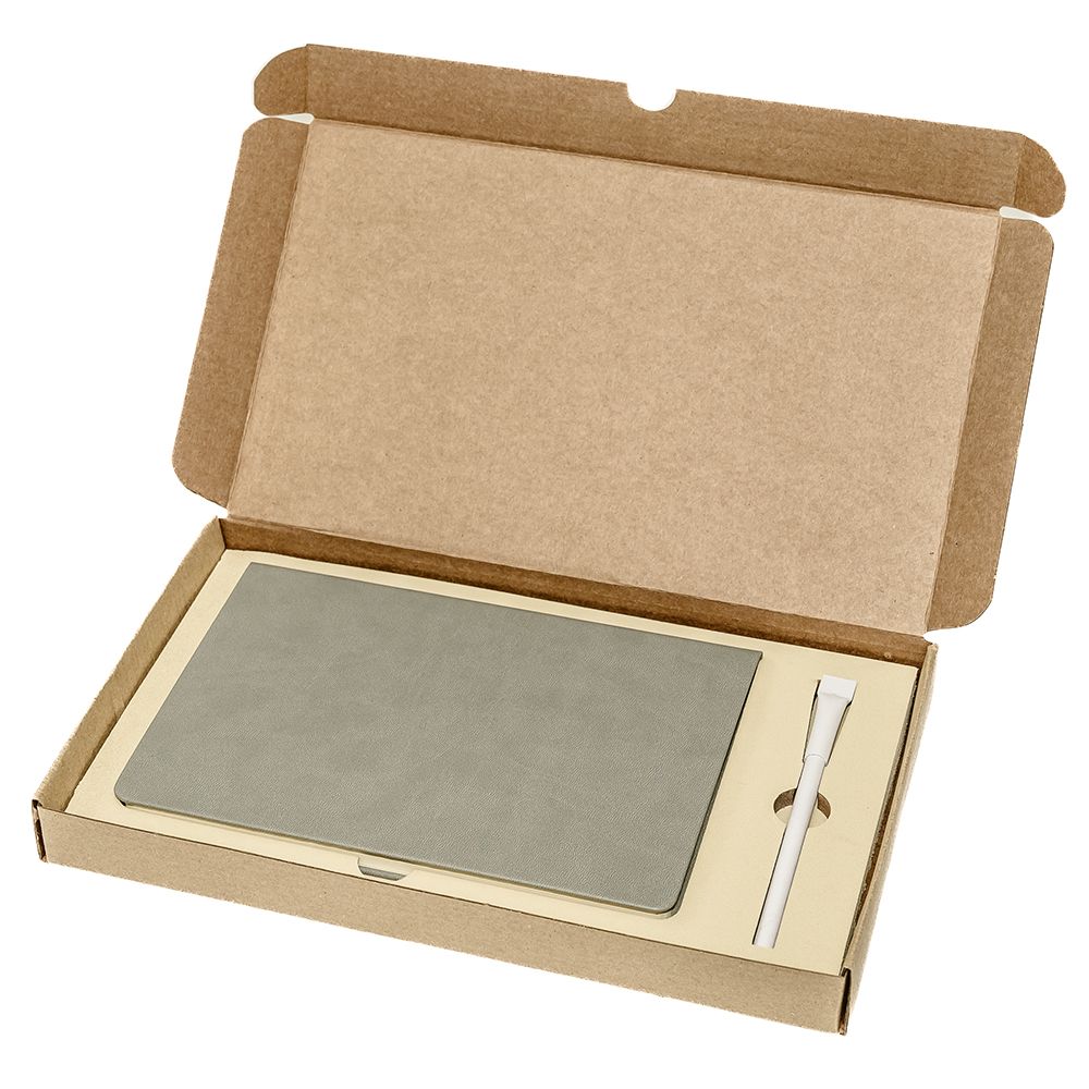 Подарочный набор в стильной картонной коробке бежевого цвета. Внутри на аккуратном ложементе располагаются ежедневник недатированный в твердом переплете и картонная ручка с колпачком.