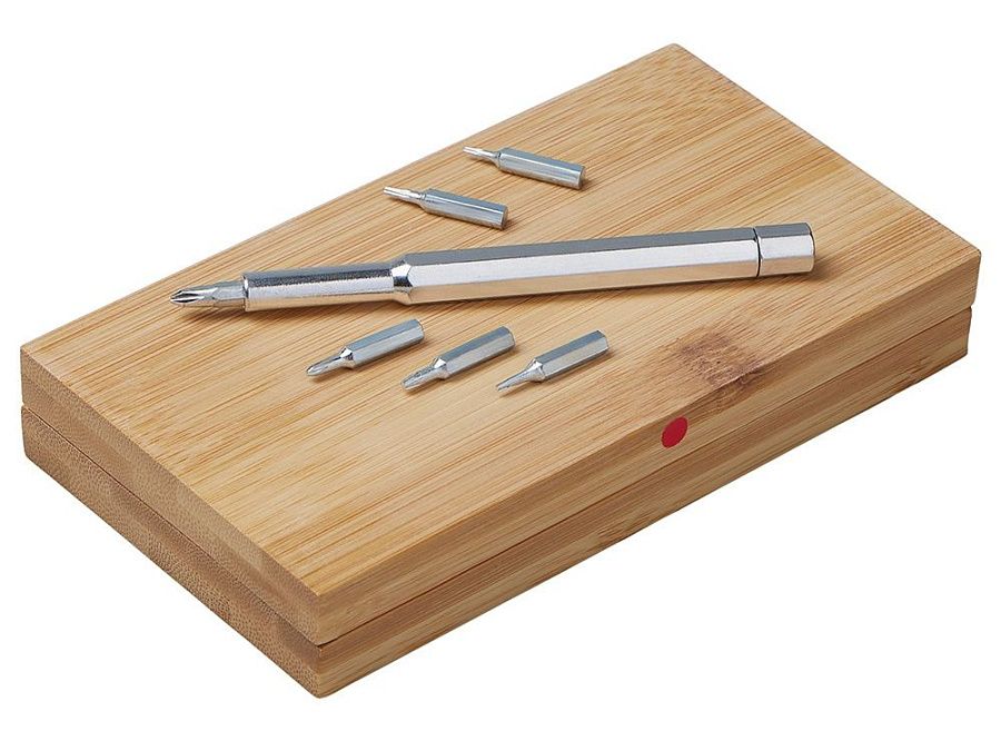 Стильный и практичный набор отверток в элегантном корпусе из натурального бамбука. Компактный кейс закрывается на магниты, а верхняя крышка отмечена круглым красным стикером для удобной идентификации. Внутри — отвертка и 24 наиболее востребованные биты: крестовые, плоские и «звездочки», которые подойдут для решения большинства бытовых и профессиональных задач. Набор выполнен из экологичных материалов — прочной стали и натурального бамбука. Классическая прямоугольная форма без выступающих деталей делает его особенно удобным для персонализации и нанесения логотипа.