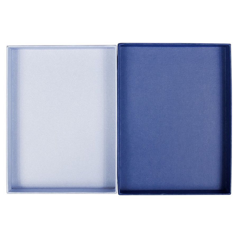 Коробка крышка/дно. Материал коробки: формованный мелованный картон, толщина стенок 2 мм, кашированный дизайнерской однотонной бумагой синего цвета.