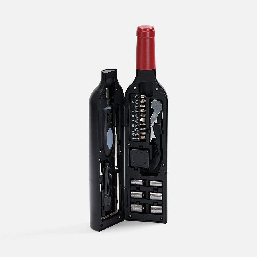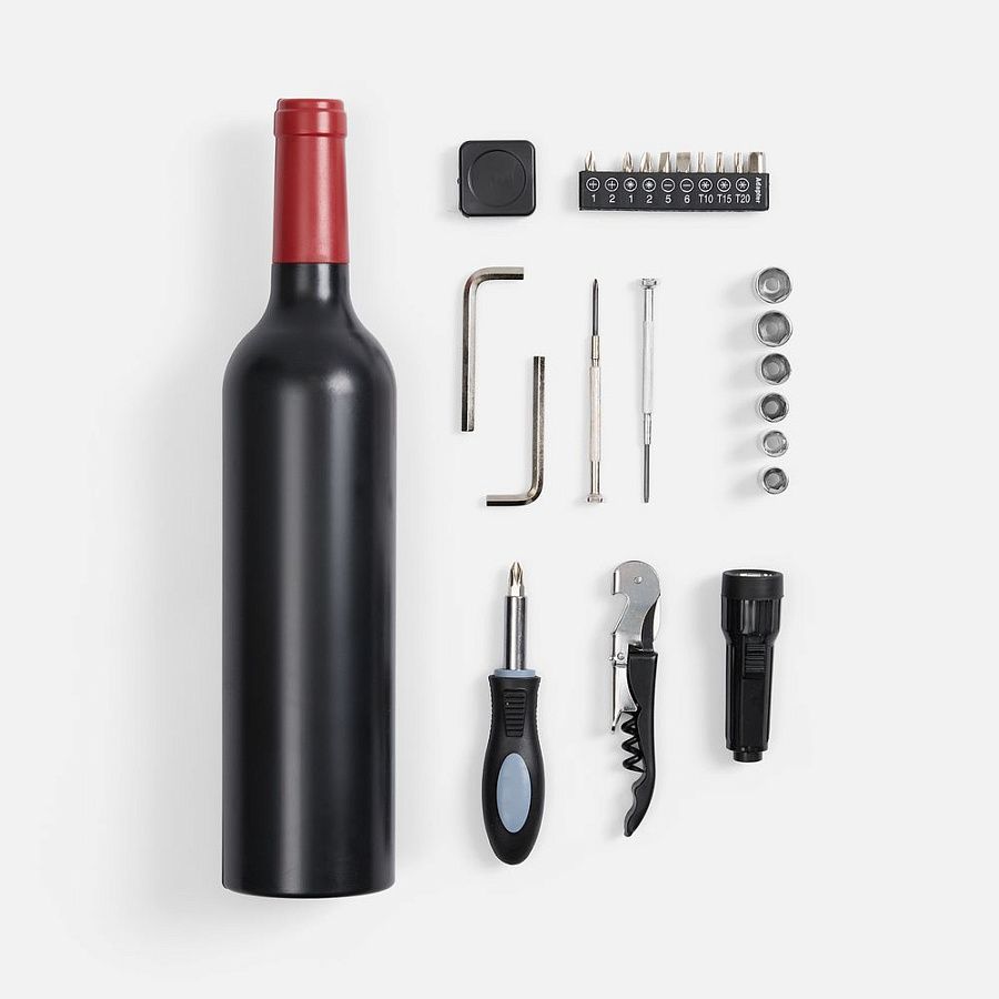 Можно и не догадаться, что внутри скрываются стандартные инструменты — главные спасатели в разных бытовых ситуациях. И конечно, в комплекте Top Shelf было не обойтись без штопора: на случай, если после сборки мебели захочется отметить успех или во время работы будет необходимо поднять себе настроение.Состав набора: