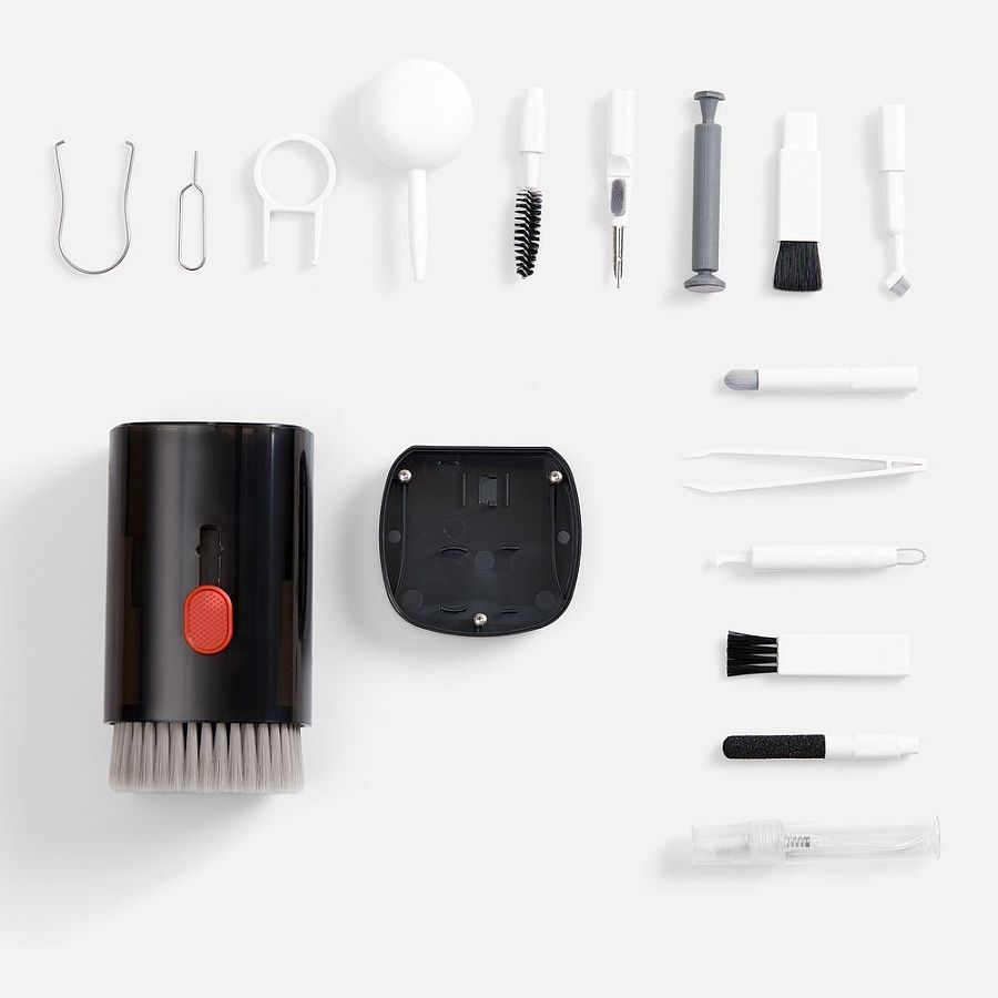 • В комплекте: большая щетка, салфетка для ухода за дисплеем, контейнер для жидкости, пластиковый пинцет, щетка с жесткой щетиной, щетка с мягкой щетиной, чистящее перо со щеткой для наушников, насадка для чистки кейса от наушников, ершик для чистки кейса от наушников, щетка с короткой щетиной, щетка с наклонной щетиной, двусторонняя насадка для чистки разъемов зарядки, двусторонняя насадка для чистки камеры, инструмент для продувки, дуговой пинцет, ключ для отсека SIM-карты, инструмент для извлечения поврежденных ключей