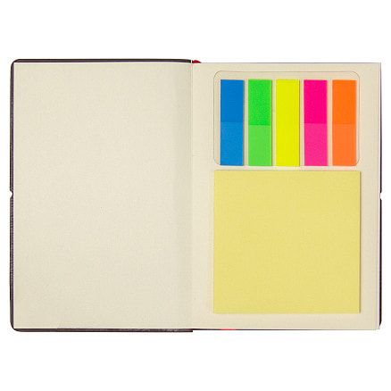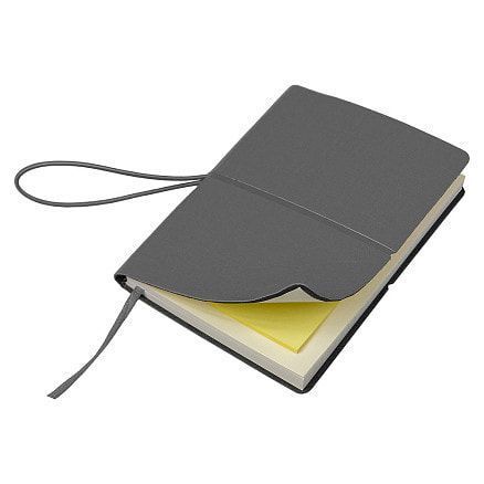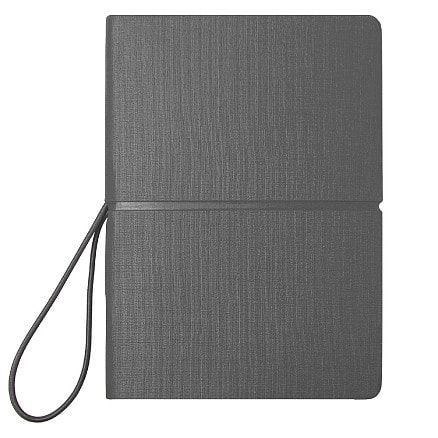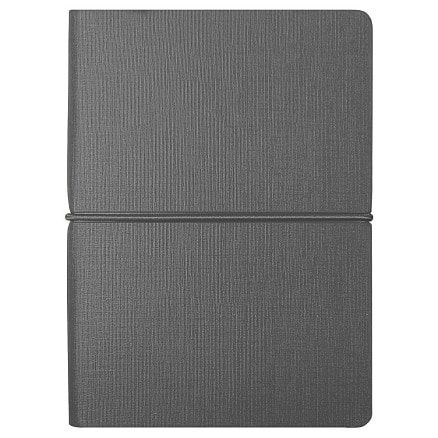 Гибкая обложка с текстурой ткани, горизонтальная резинка-фиксатор и закладка-лента. Внутри — страницы в линейку и набор цветных стикеров для заметок, маркировки и планирования.