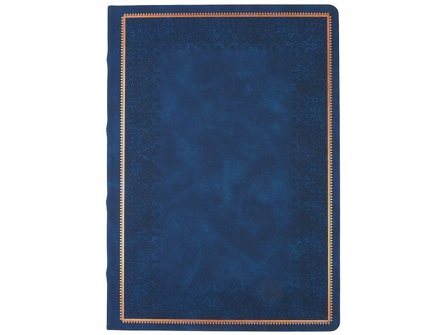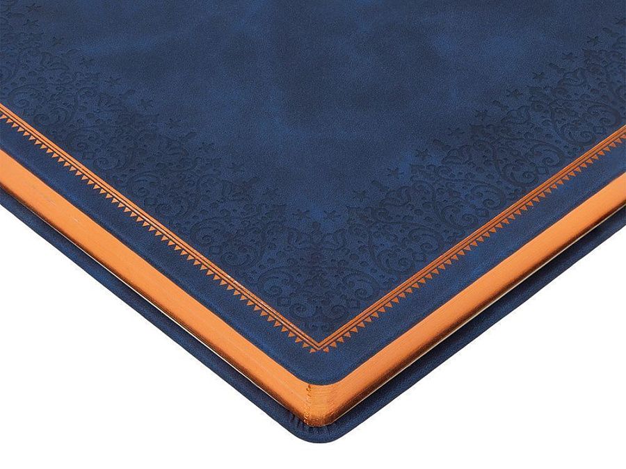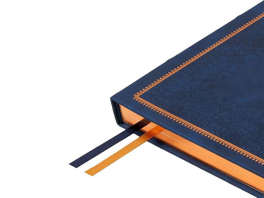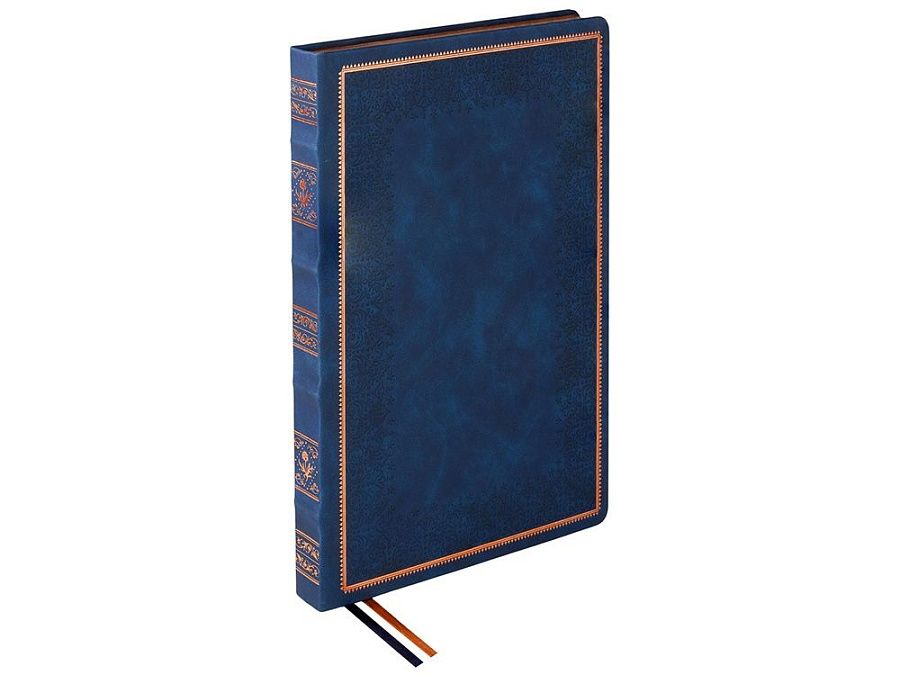 Недатированный ежедневник "Royal" формата А5 с твердой обложкой из искусственной кожи с имитацией нубука украшен художественным бронзовым и блинтовым тиснением. Внутри 256 страниц, выполненных из качественной бежевой бумаги в линейку плотностью 100 г/м². Два шелковых ляссе в цвет обреза блока и обложки облегчают навигацию по записям. Французский корешок дополнительно декорирован изящным бронзовым тиснением в виде виньеток. Скругленные углы обложки и блока подчеркивают стильный дизайн изделия, а блеск бронзового обреза дарит ежедневнику благородный и роскошный внешний вид.