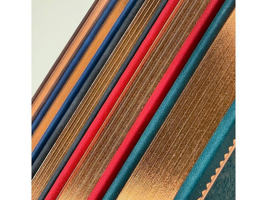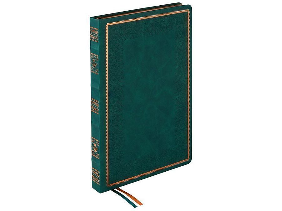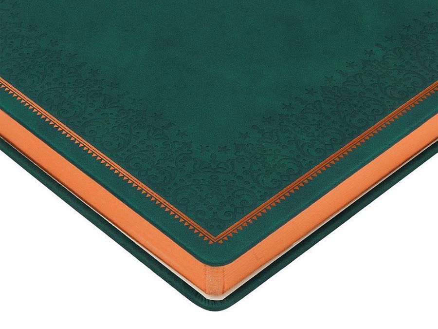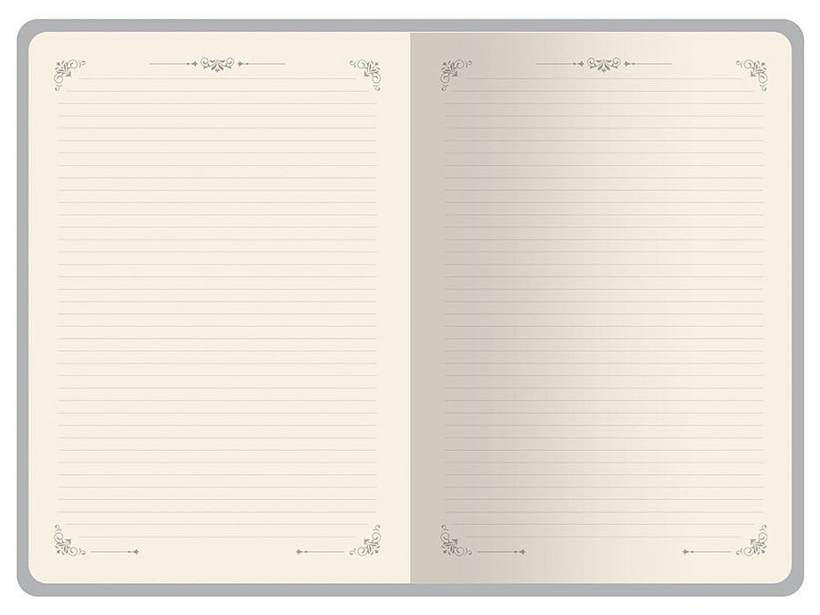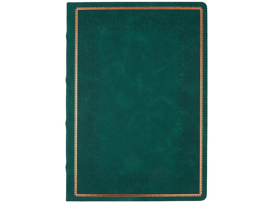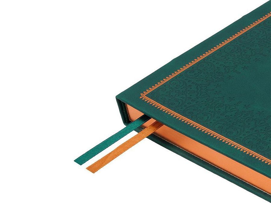 Недатированный ежедневник "Royal" формата А5 с твердой обложкой из искусственной кожи с имитацией нубука украшен художественным бронзовым и блинтовым тиснением. Внутри 256 страниц, выполненных из качественной бежевой бумаги в линейку плотностью 100 г/м². Два шелковых ляссе в цвет обреза блока и обложки облегчают навигацию по записям. Французский корешок дополнительно декорирован изящным бронзовым тиснением в виде виньеток. Скругленные углы обложки и блока подчеркивают стильный дизайн изделия, а блеск бронзового обреза дарит ежедневнику благородный и роскошный внешний вид.