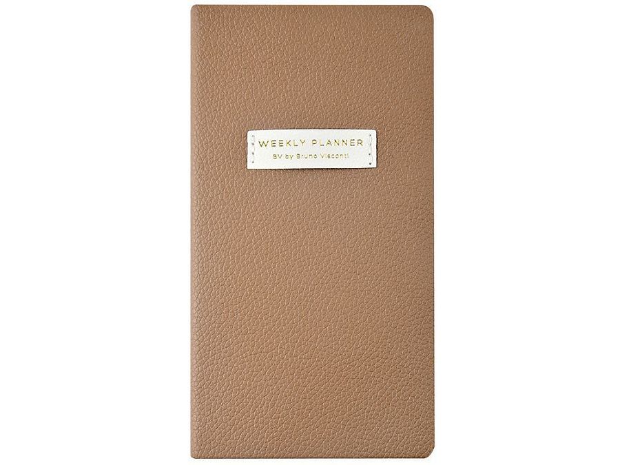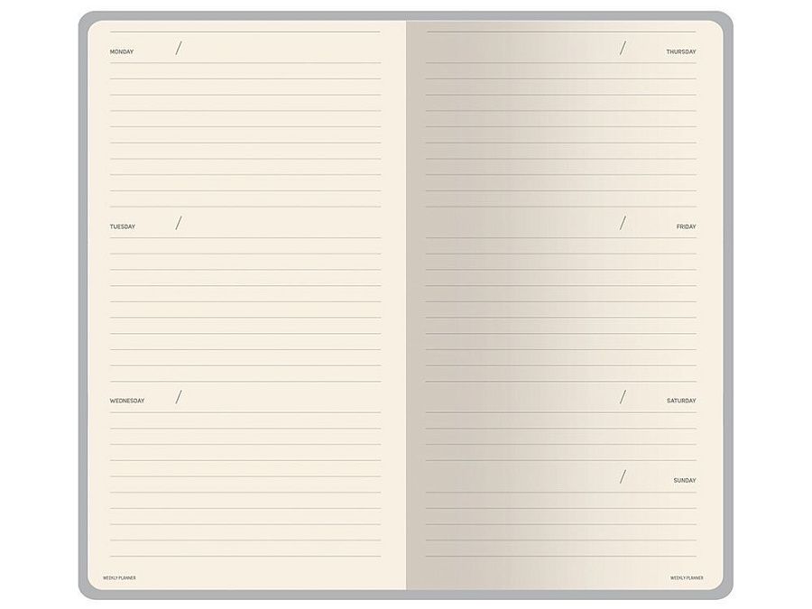 Внутри — недатированный блок формата А6 (84×160 мм) на бежевой бумаге 80 г/м². Книжный переплёт хорошо раскрывается, а скруглённые углы одновременно придают еженедельнику премиальный вид и защищают края при носке. Ляссе‑закладка выполнена в цвет обложки и помогает быстро находить нужную страницу.