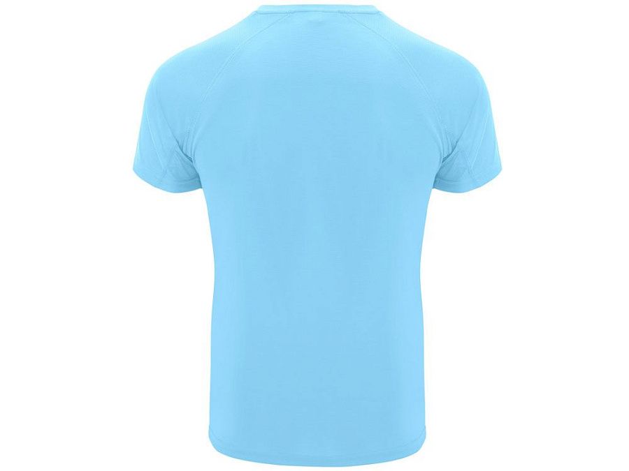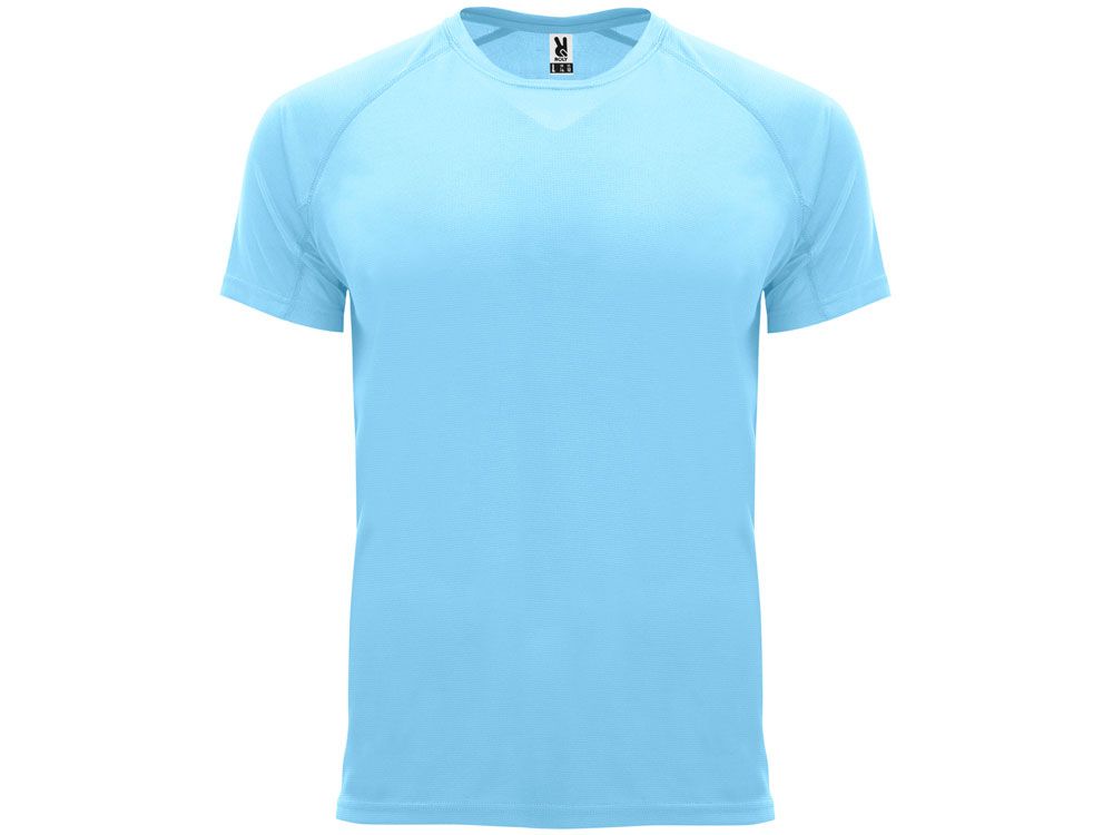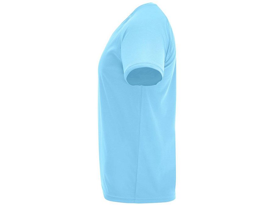 Спортивная футболка с коротким рукавом реглан. Круглый вырез горловины с отделкой плоским швом. Рукав сложного кроя для обеспечения дополнительного удобства при занятиях спортом. Отделка плоским швом с застилом по пройме и рукавам.