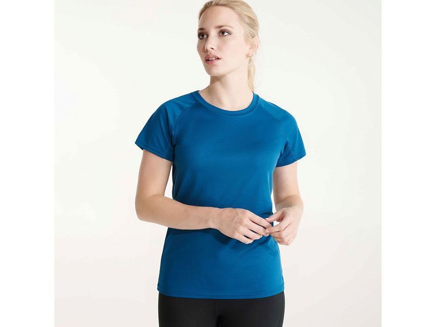 Спортивная футболка с коротким рукавом реглан для женщин. Круглый вырез горловины с отделкой плоским швом. Рукав сложного кроя для обеспечения дополнительного удобства при занятиях спортом. Отделка плоским швом с застилом по пройме и рукавам.