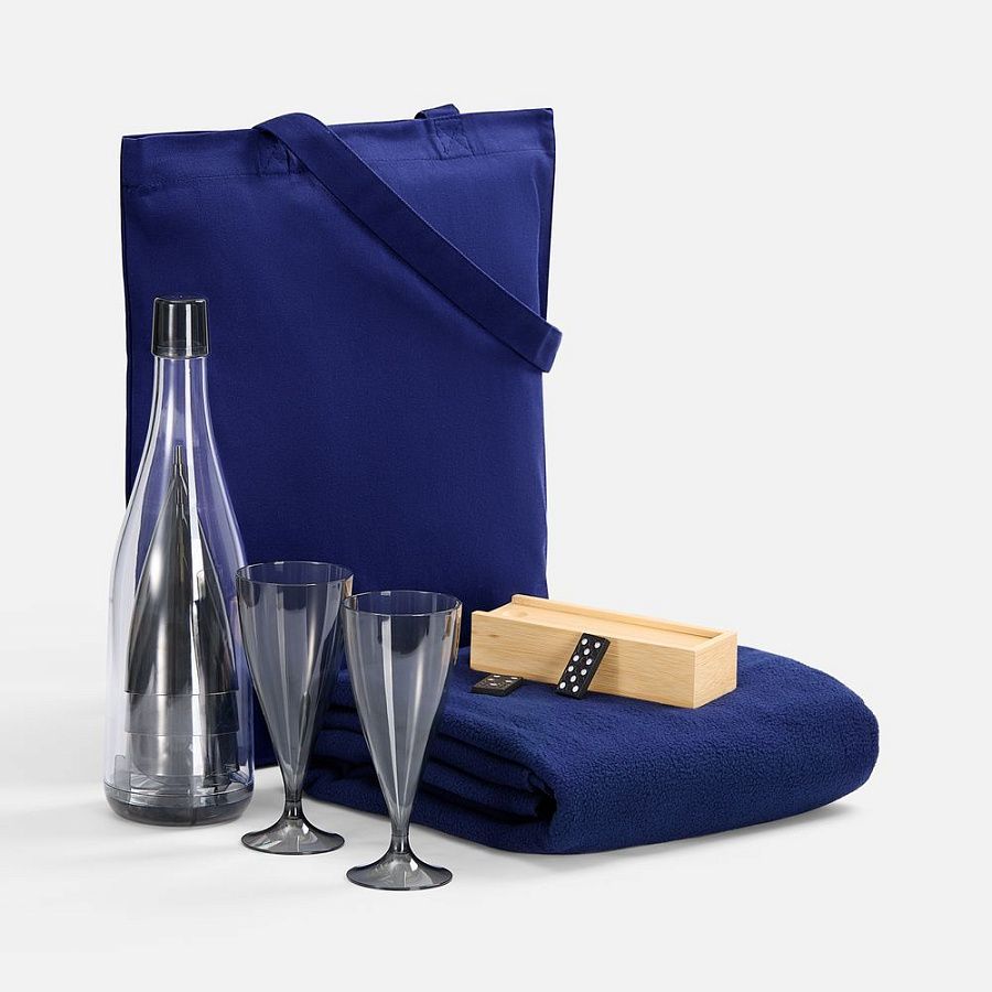 плед - флис, плотность 180 г/м²; набор бокалов - пластик; футляр для домино - бамбук; костяшки - МДФ; сумка - хлопок 100%, плотность 220 г/м²; саржа