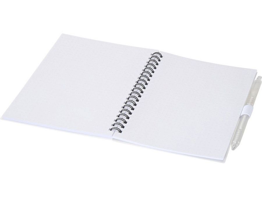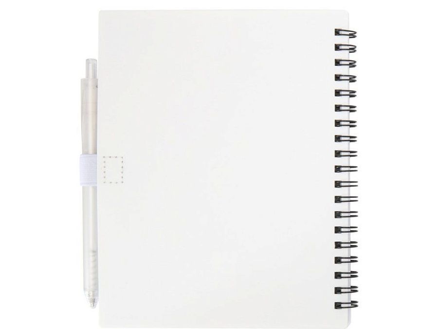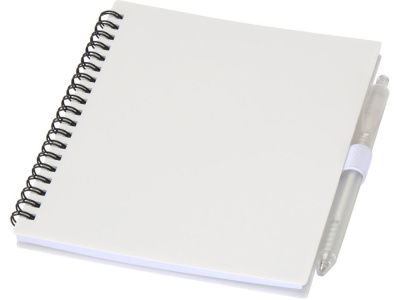 Блокнот Niove с мягкой обложкой изготовлен из переработанной пластмассы, имеет 70 нелинованных листов из бумаги плотностью 70 г/м². Блокнот имеет квадратные углы и петлю для ручки. Размер блокнота: 140 х 178 мм. Шариковая ручка также изготовлена из переработанной пластмассы. Цвет чернил: синий. Длина непрерывной линии: 1000 метров. Диаметр пишущего узла: 1,0 мм.